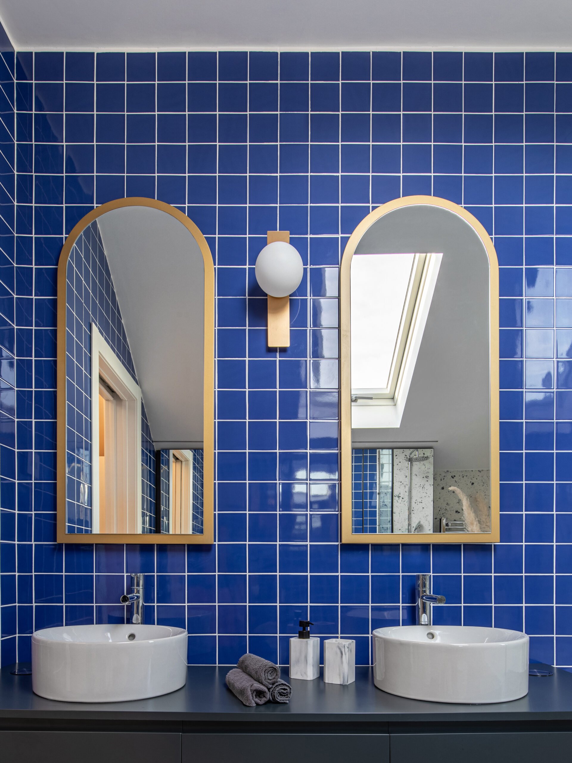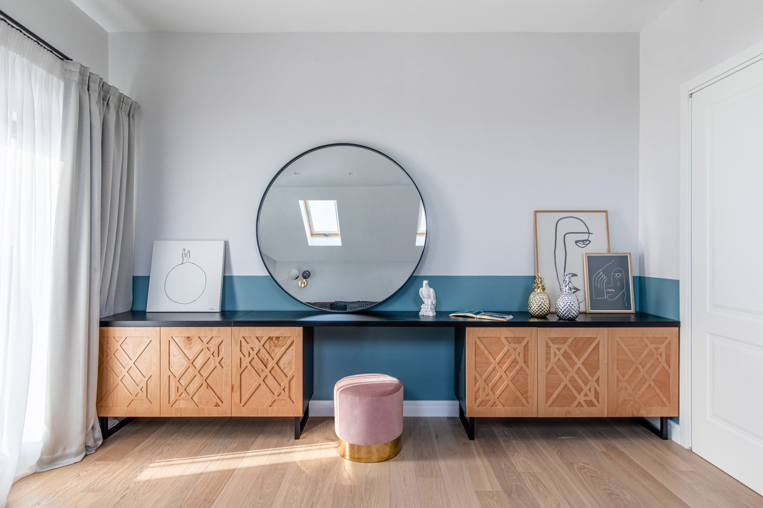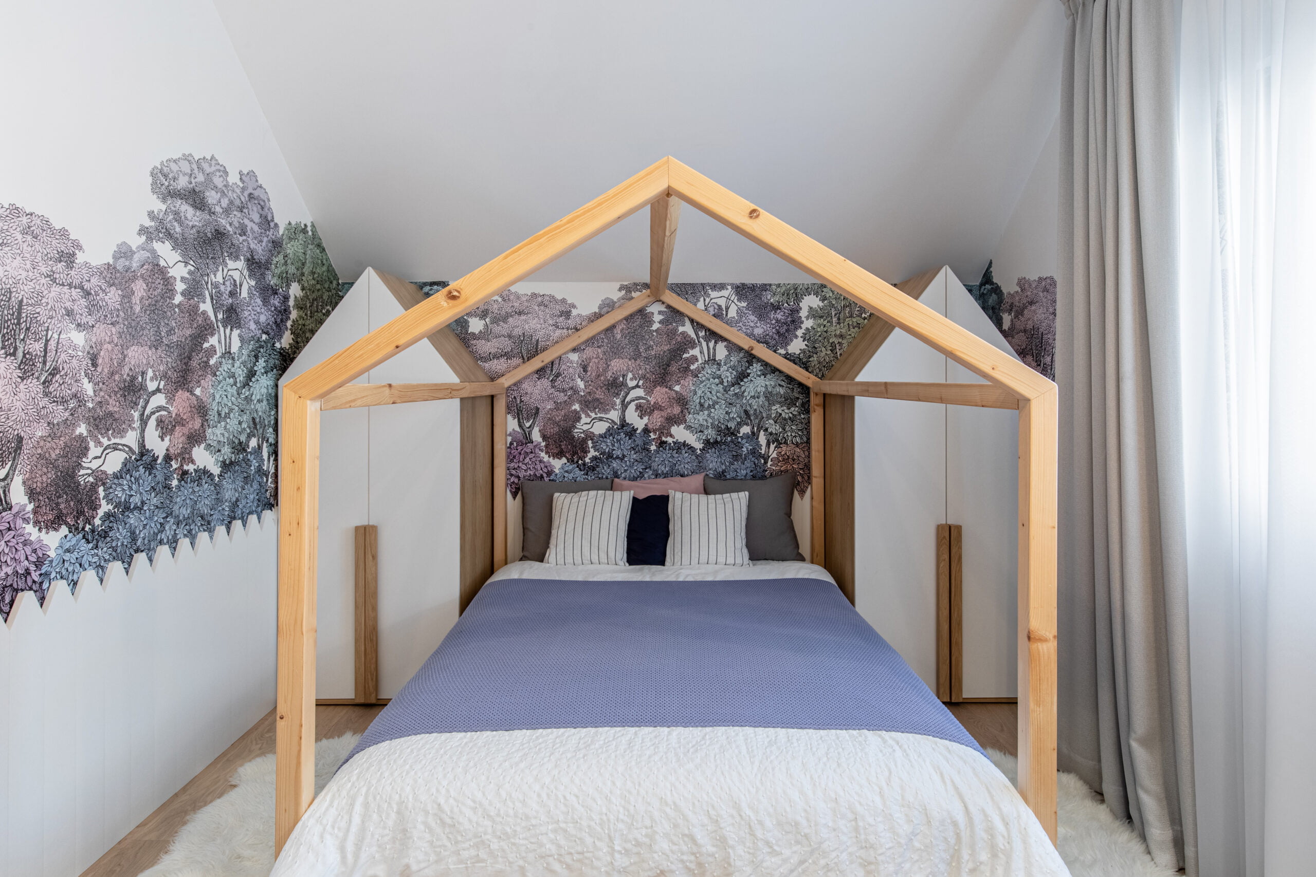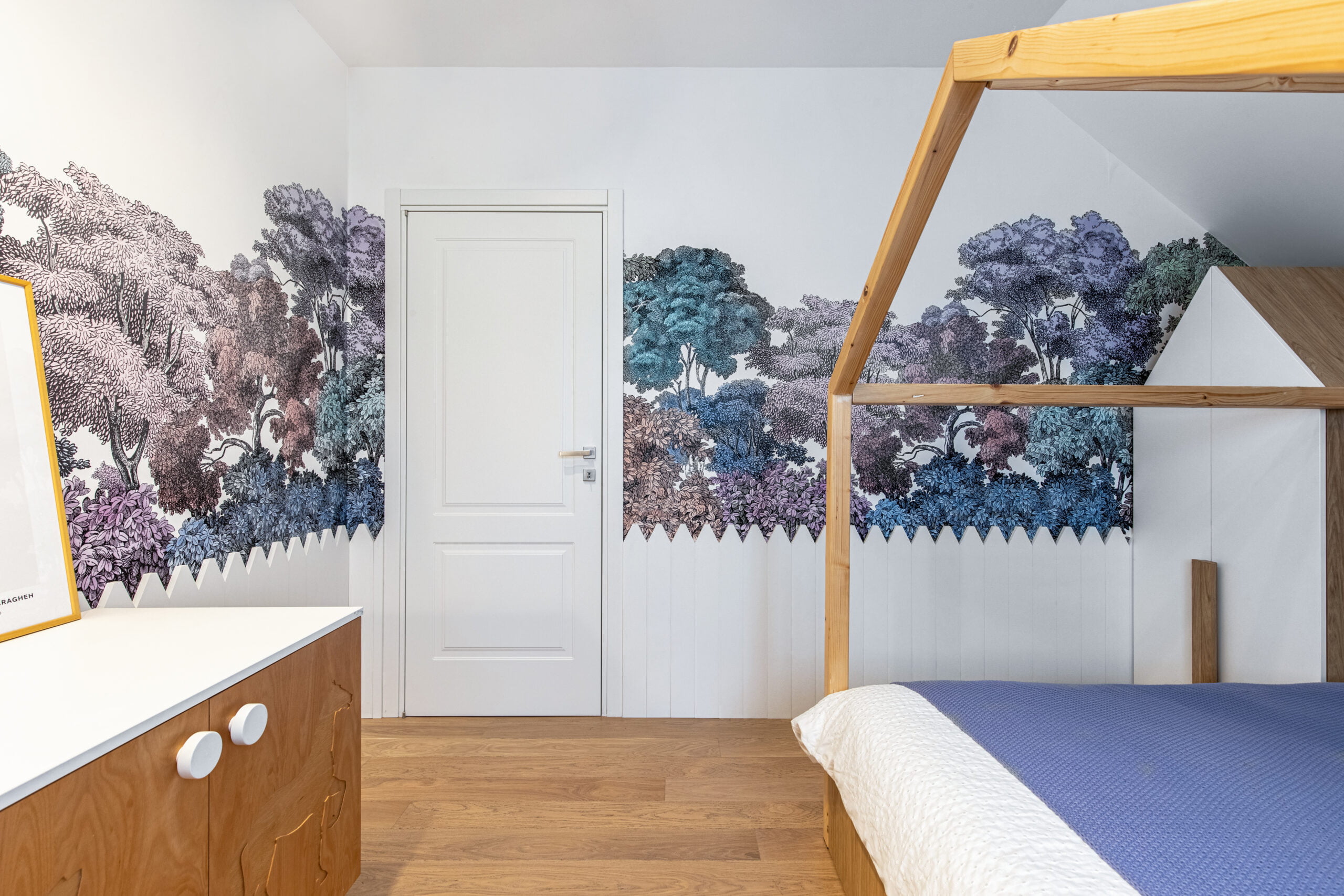 The kitchen is designed with a fresh and cheerful ambiance, featuring pastel-colored furniture and delightful accessories. Each bedroom is personalized with bright colors, tailored to suit the occupants’ preferences. The bathrooms provide a serene retreat with subtle pops of color.