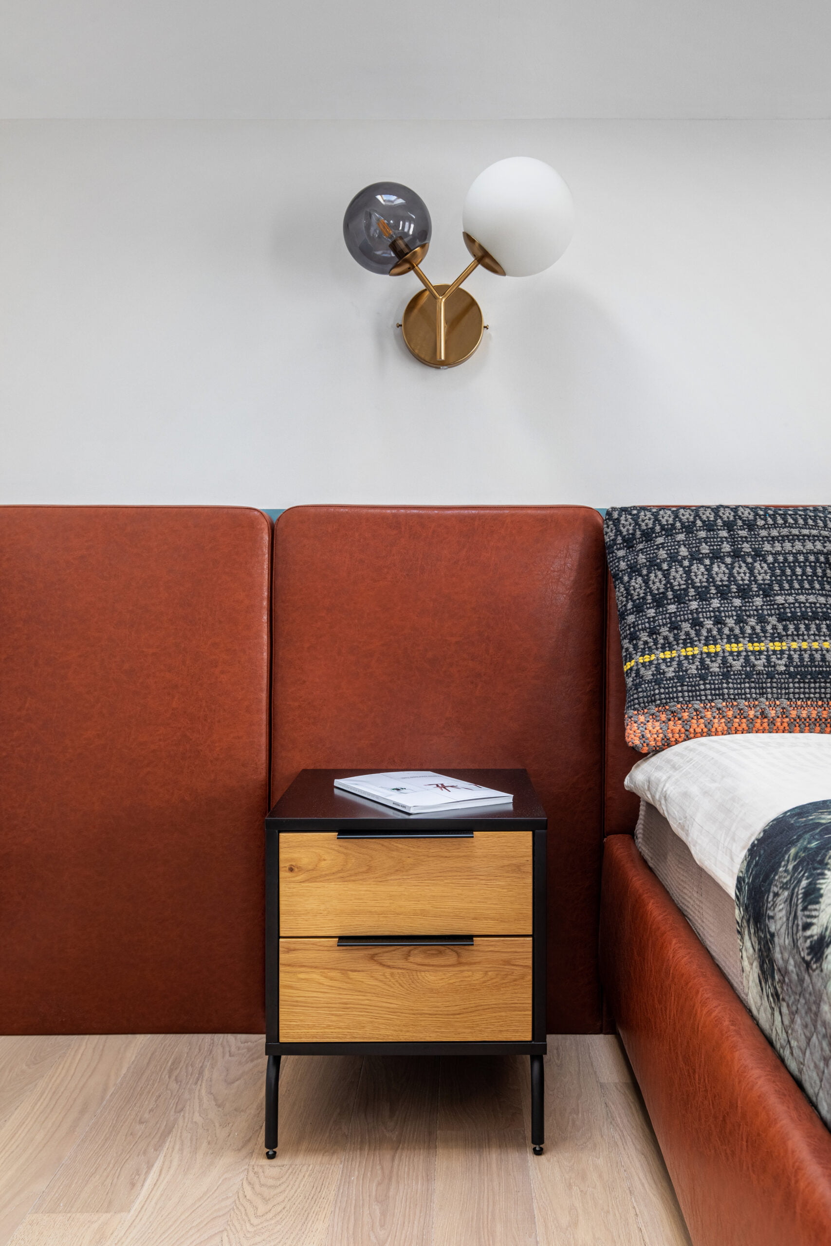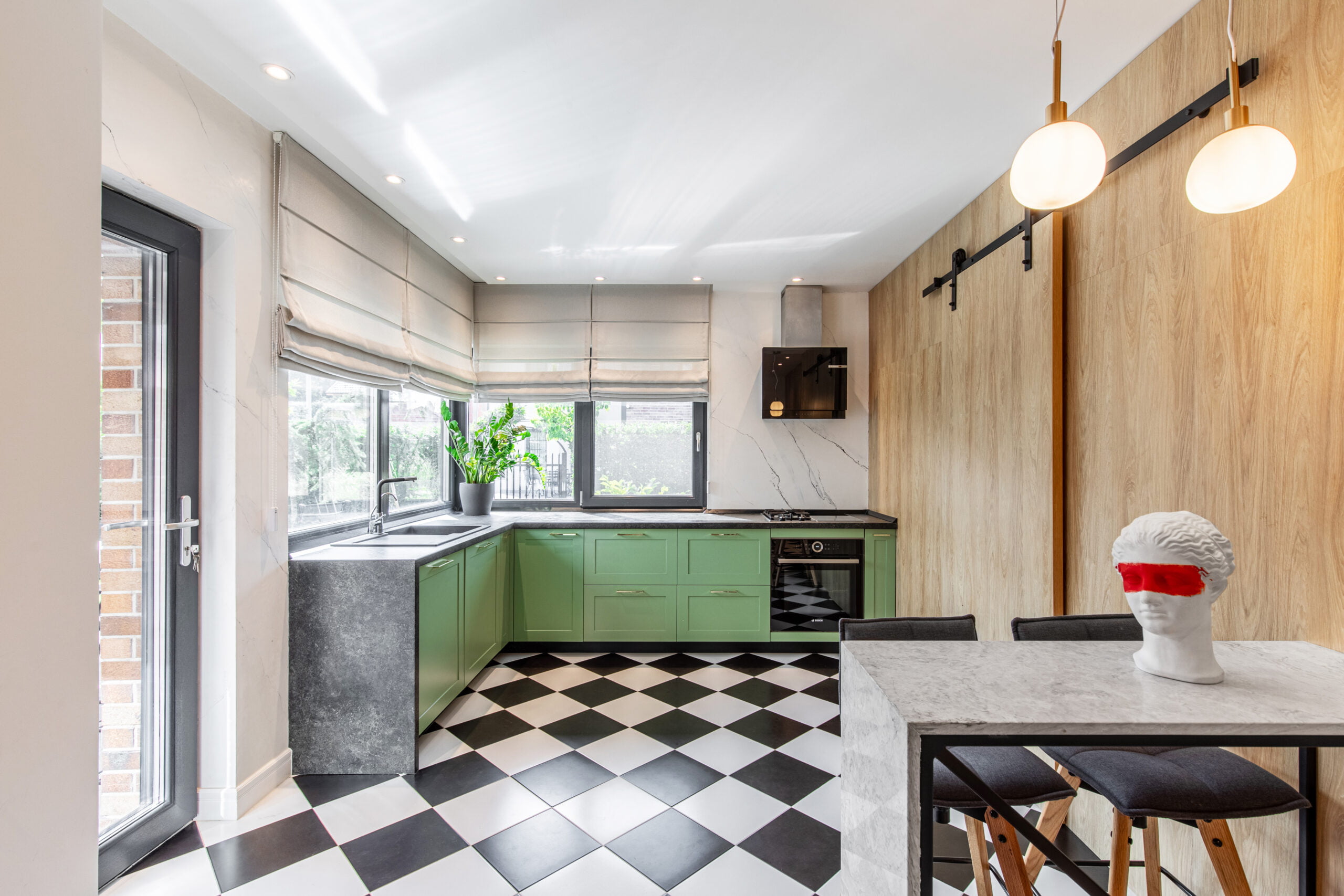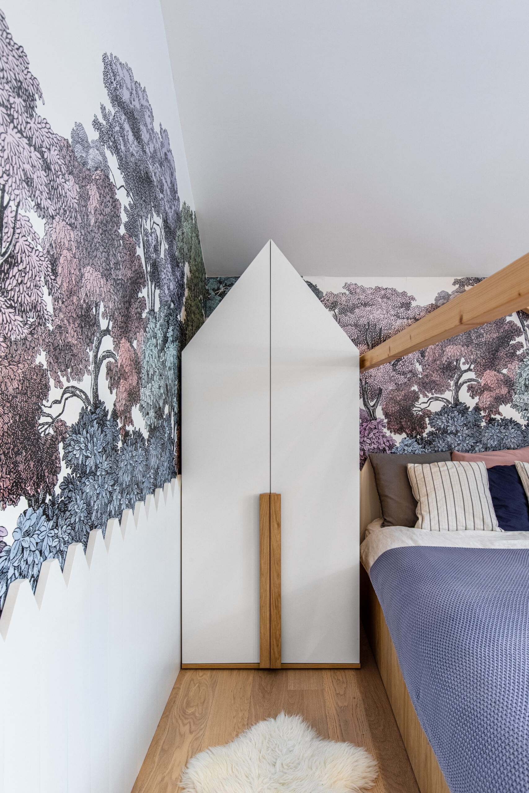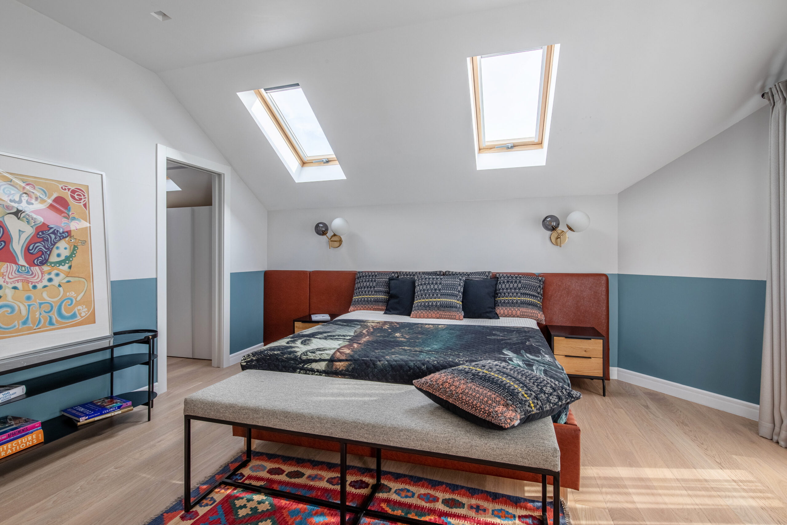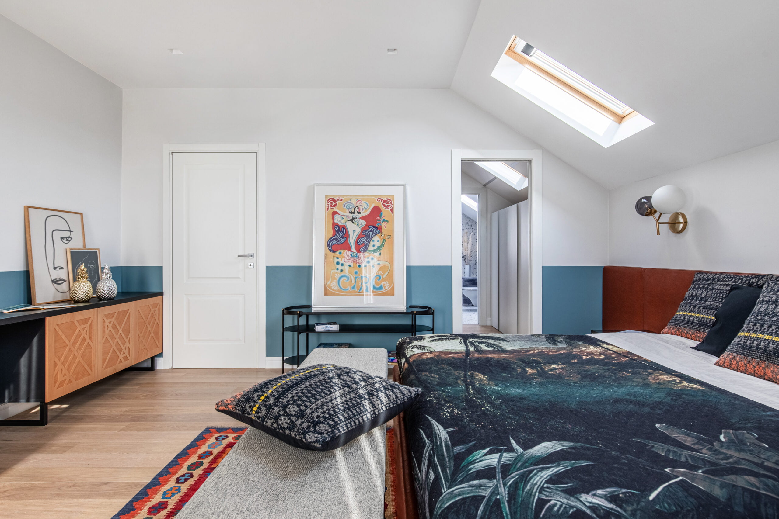 The kitchen is designed with a fresh and cheerful ambiance, featuring pastel-colored furniture and delightful accessories. Each bedroom is personalized with bright colors, tailored to suit the occupants’ preferences. The bathrooms provide a serene retreat with subtle pops of color.