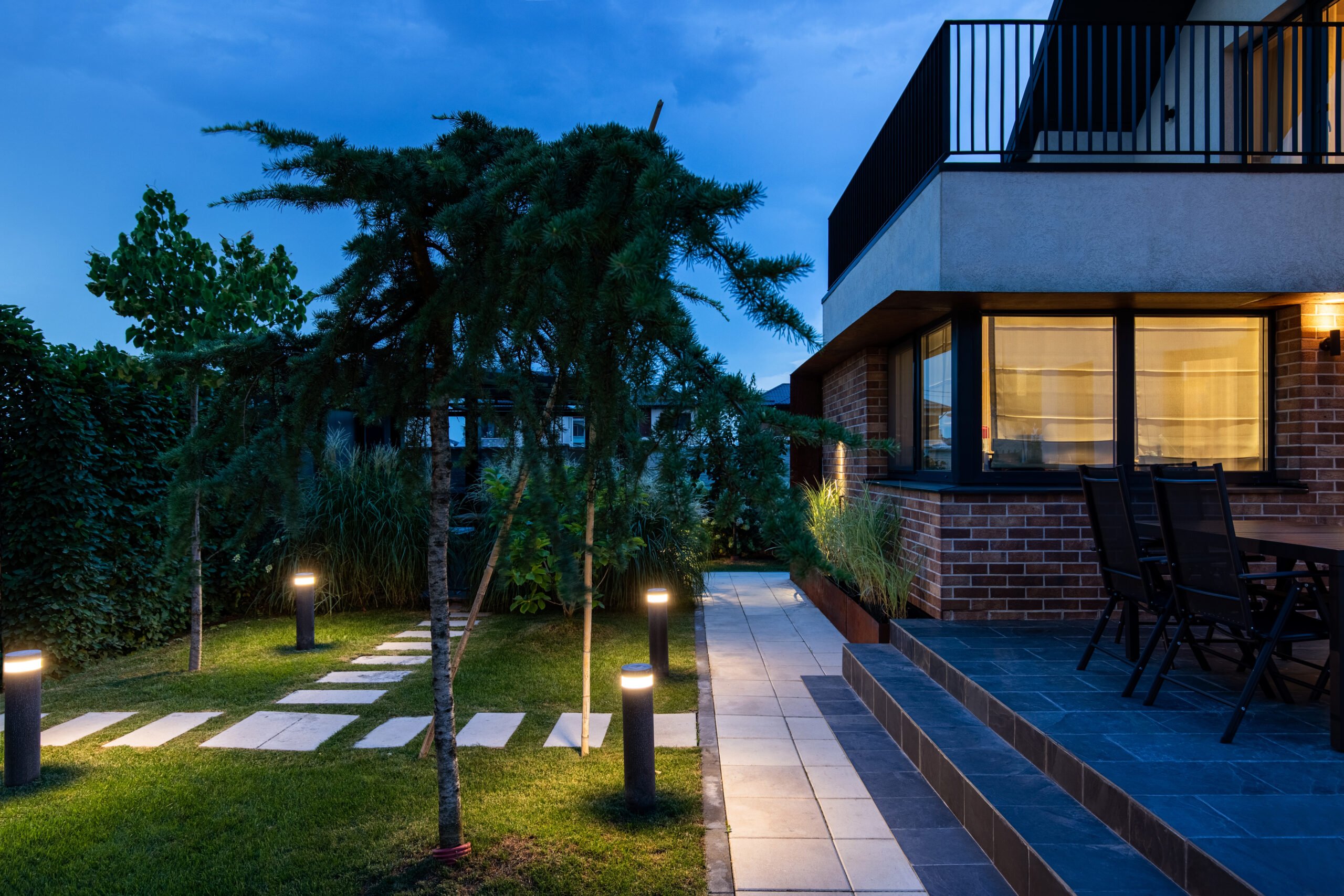 The back terrace offers a perfect place for relaxation and entertainment, complete with comfortable seating adorned with colorful cushions.